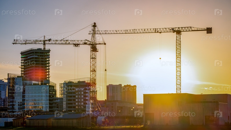 Строительство. строительные краны, небоскребы. силуэты на закате
