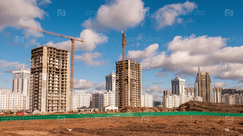 Панорамы строительства нового микрорайона в Минске. Недостроенные дома, строительные краны, голубое небо с белыми облаками