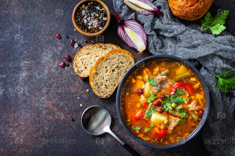Домашний мясной томатный суп с тушеной говядиной и фасолью, овощи на каменной столешнице. Плоская планировка, вид сверху. Скопируйте пространство