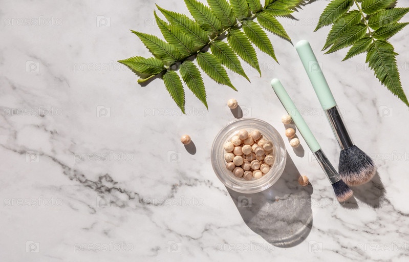 Плоский макияж. Декоративная косметика и кисти для макияжа на мраморной столешнице. Скопируйте пространство