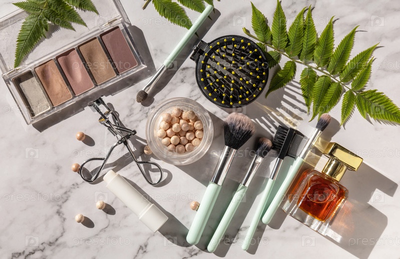 Плоский макияж. Профессиональный макияж. Кисти, духи и другая декоративная косметика на мраморной столешнице
