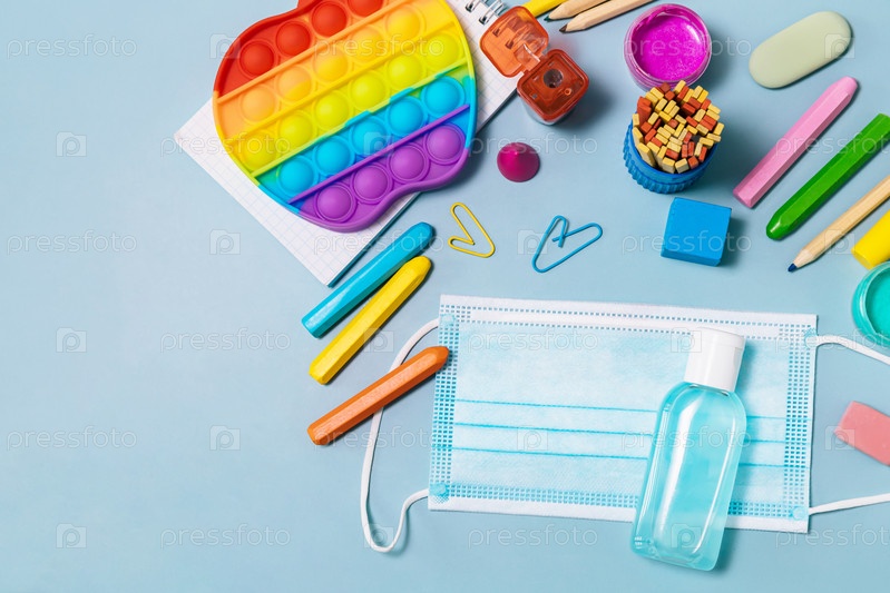Школьные принадлежности, антистресс-поппит, маска для лица, бутылка дезинфицирующего средства для возвращения в школу на синем фоне. меры предосторожности против COVID-19. вид сверху на плоский фон. копировать пространство