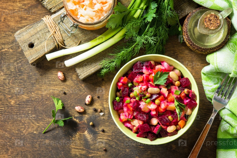 Винегрет салата из свеклы с квашеной капустой, маринованным огурцом и овощами на деревянном деревенском столе. Вид сверху на плоский фон. Скопируйте пространство