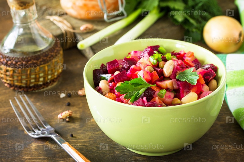 Винегрет салата из свеклы с квашеной капустой, маринованным огурцом и овощами на деревянном деревенском столе