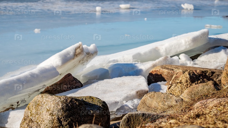 Весенний ледоход. Льдины сползают на берег