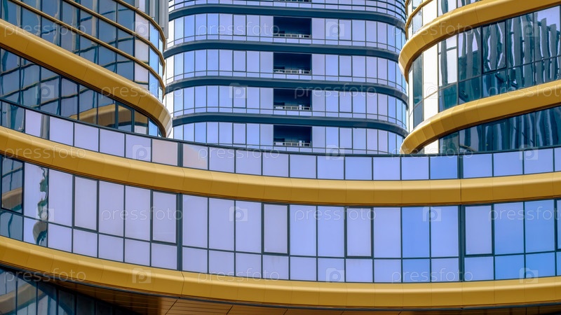 Фасад современного здания. Стекло и металл. Золото и темно-синий