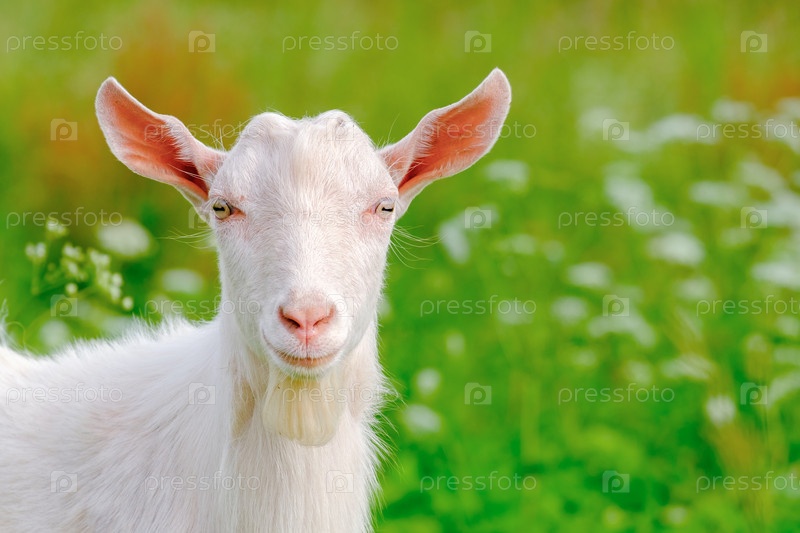 Молодая белая коза на лугу. Домашний скот. Анфас портрет. Крупный план. Смотрит в объектив