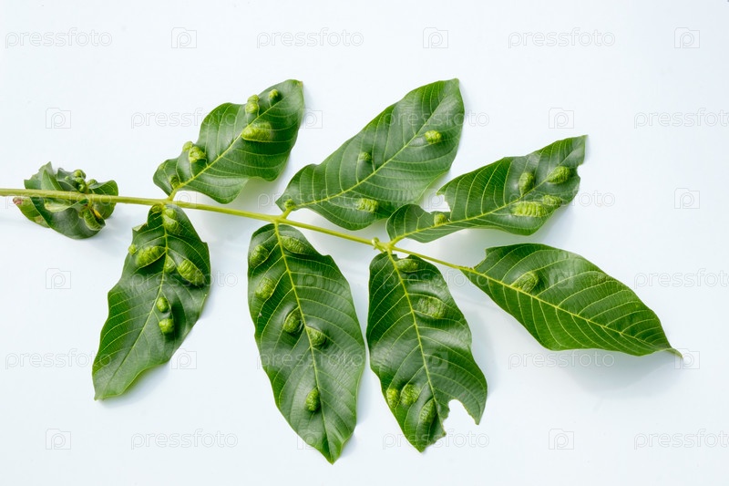 Aceria erinea - вид клеща, который вызывает галь на листьях грецкого ореха Juglans regia. Вид верхней части листа грецкого ореха, пораженного вредителем