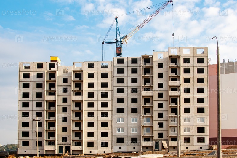 Строительство жилого дома из бетонных блоков. Вид на фасад недостроенного здания