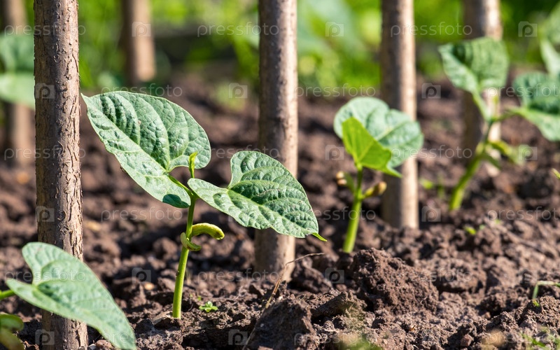 Молодые ростки спаржевой фасоли подряд после прорастания. Органическое домашнее хозяйство. Выборочный фокус