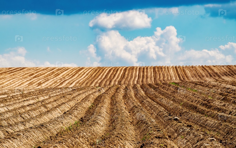 Картофельное поле после посева. Ряды посадок уходят за горизонт