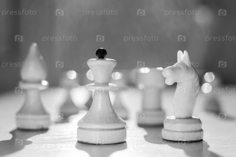 Шахматные фигуры. Белая королева с подачей. Черно-белое изображение. Концепция командной работы