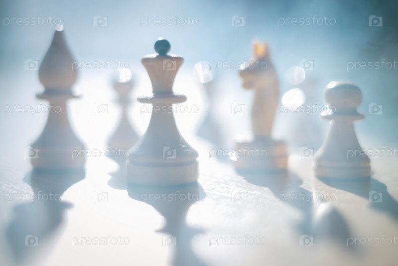 Силуэты шахматных фигур в дыму войны. Синяя дымка и дым или туман. Абстракция боевой стратегии. Бизнес