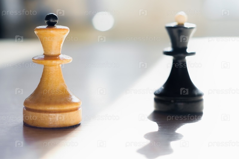 Шахматные фигуры, залитые солнечным светом. Белые и черные королевы. Белый в фокусе, черный размыт. Абстракция противостояния. Бизнес