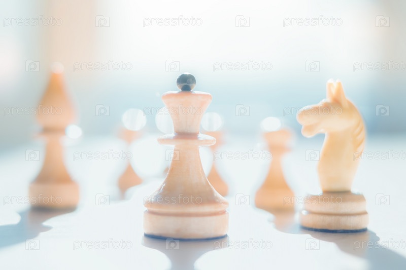 Силуэты шахматных фигур, залитых солнечным светом. Изображение находится в высоком ключе. Шахматная королева ведет воинов. Абстракция боевой стратегии. Бизнес