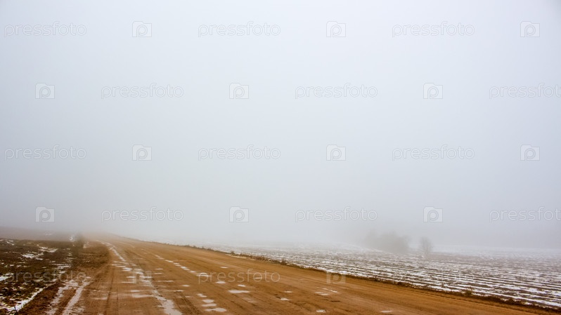 Плохая проселочная дорога в тумане осенью