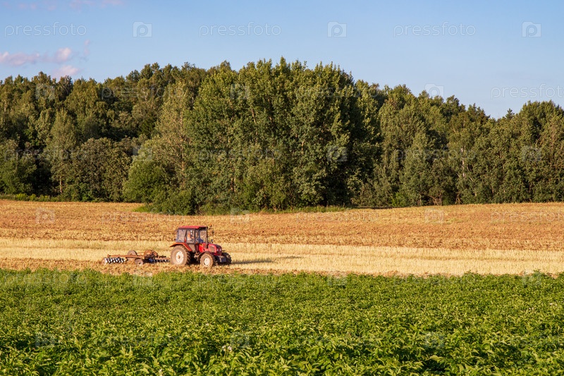 Трактор вспахивает поле в ясный день