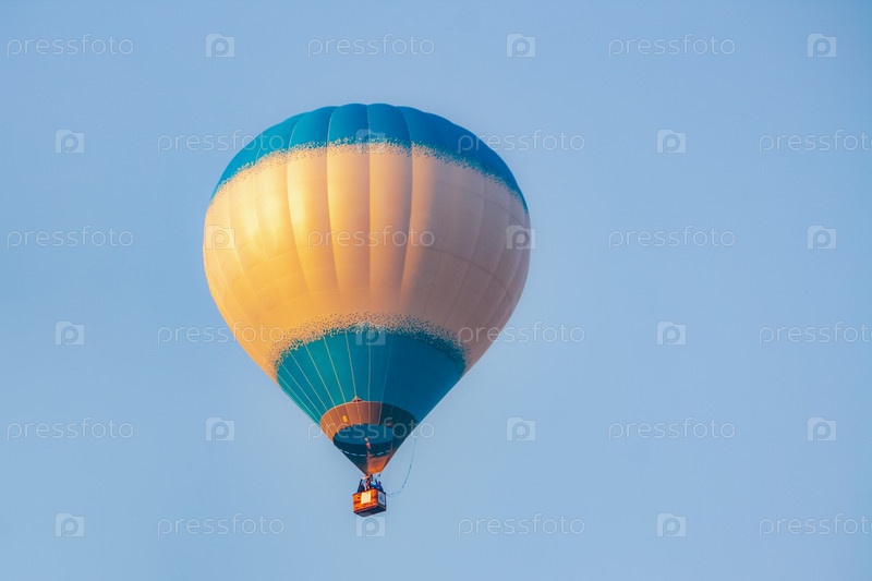 Синий шар на рассвете в голубом небе. солнечные лучи отражаются