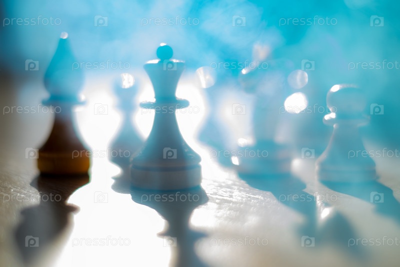 Шахматные фигуры в расфокусе и дыму. Концепция боя на поле боя, тактика и стратегия