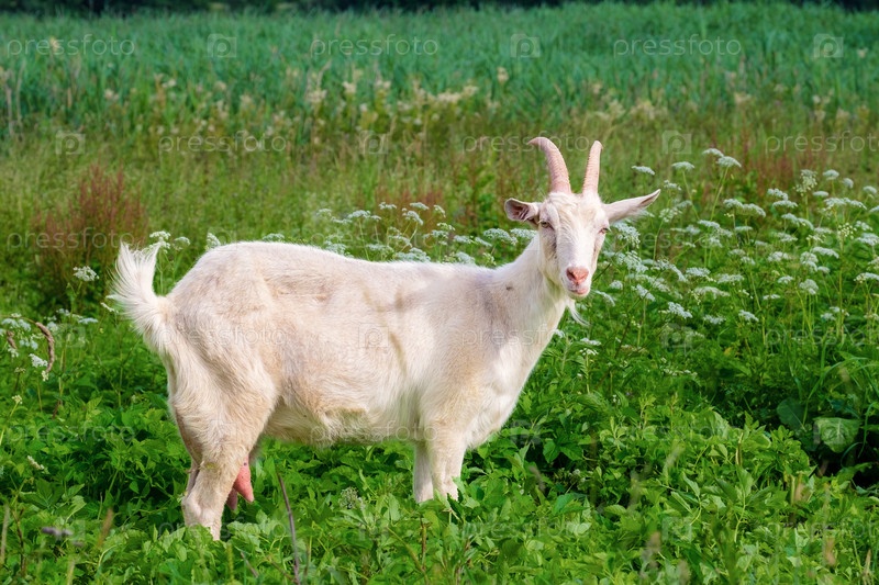 Белая коза в полный рост в профиль. Смотрит в камеру и жует траву