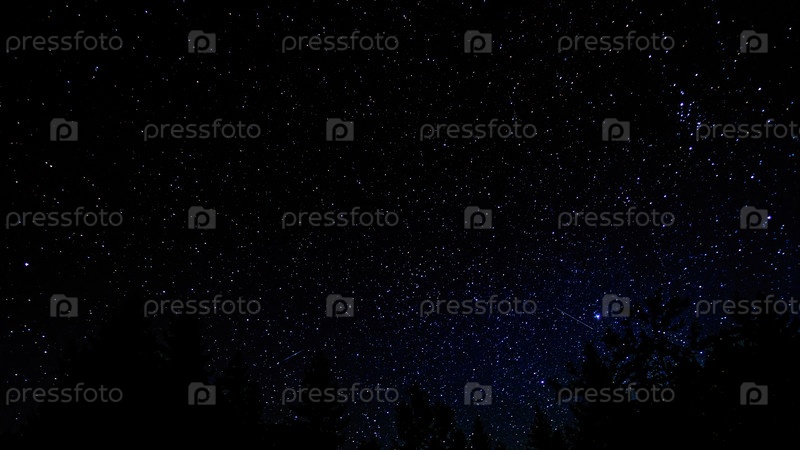Ночное звездное небо. Верхушки деревьев. Метеориты