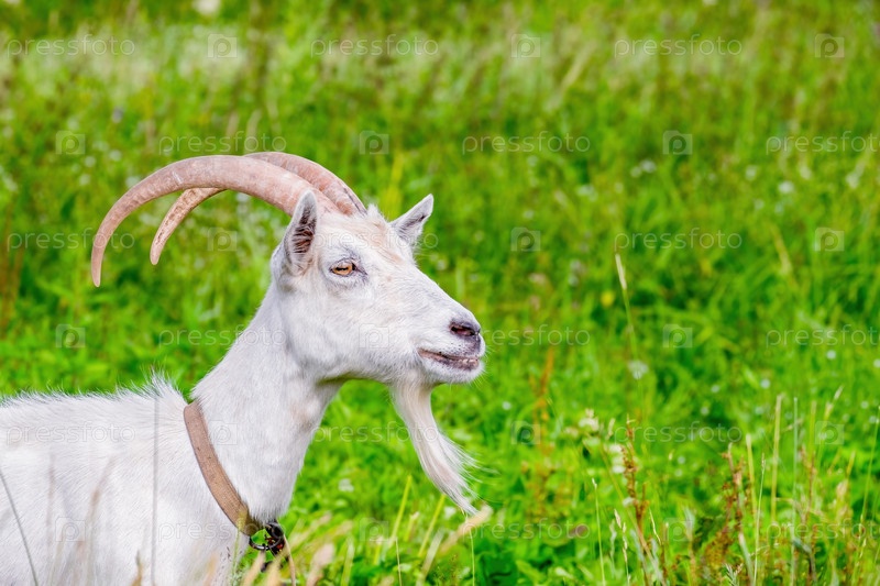Белая рогатая коза с бородой пасется на зеленом лугу. Просмотр профиля. Крупный план