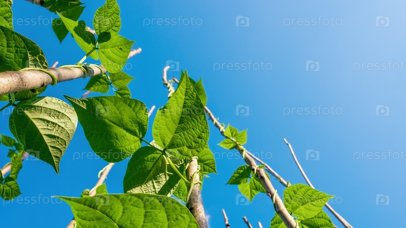 Фасоль фасоль. Бобовые растения поднимаются к небу на столбах