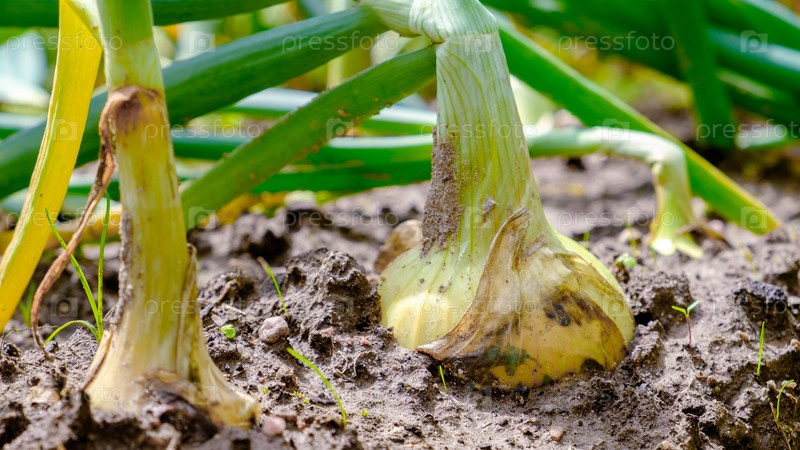 Лук. Корень лукового растения в земле крупным планом. Выборочный фокус