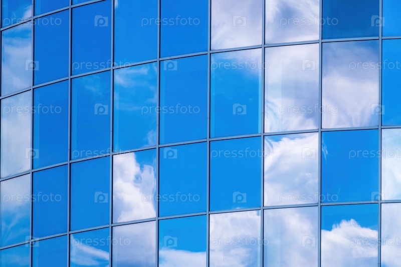 Синий стеклянный фасад офисного здания. Отражение облаков