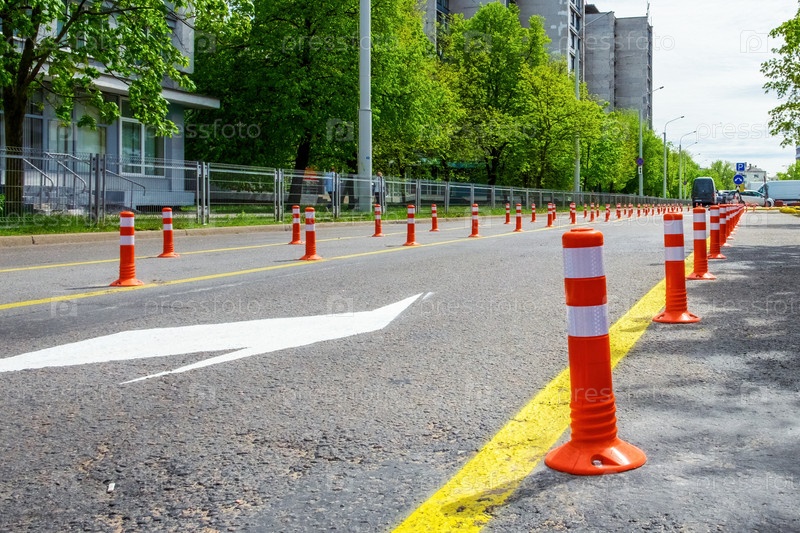 Оранжевые столбы на дороге. На дороге выстроились пластиковые столбы для разделения полос движения