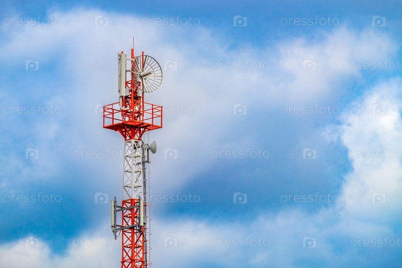 Радиомачта (башня) с антеннами для телекоммуникаций и радиовещания и облачное небо. Крупный план