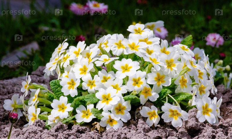 Primula vulgaris, примула обыкновенное яркое цветущее растение Primulaceae.Белые цветки в саду