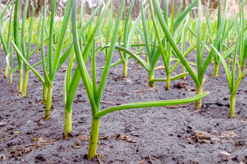 Чеснок. Молодые растения в ряду на грядке на приусадебном участке ранней весной