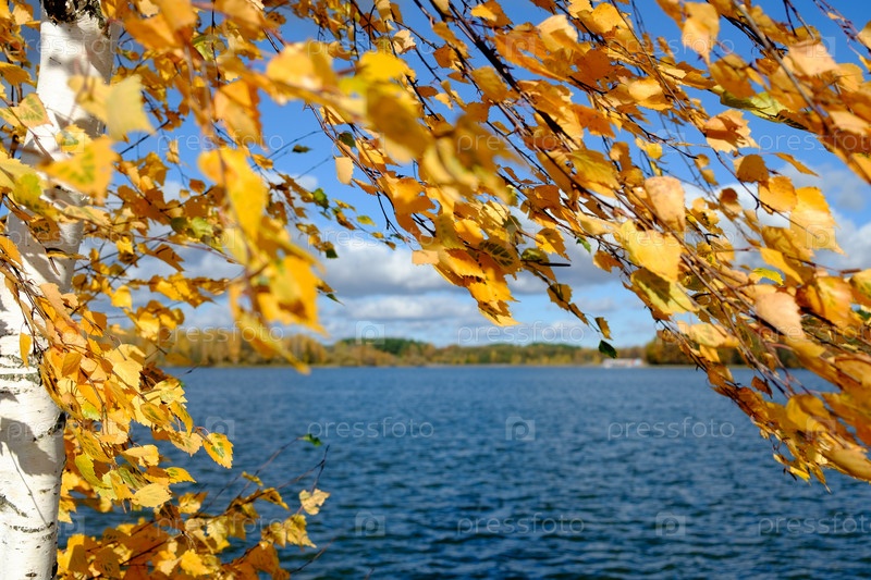 Яркая осень. Озеро и желтые листья осенью
