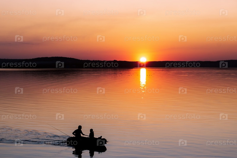 Силуэты рыбаков на лодке, возвращающейся с рыбалки вечером на фоне заходящего солнца