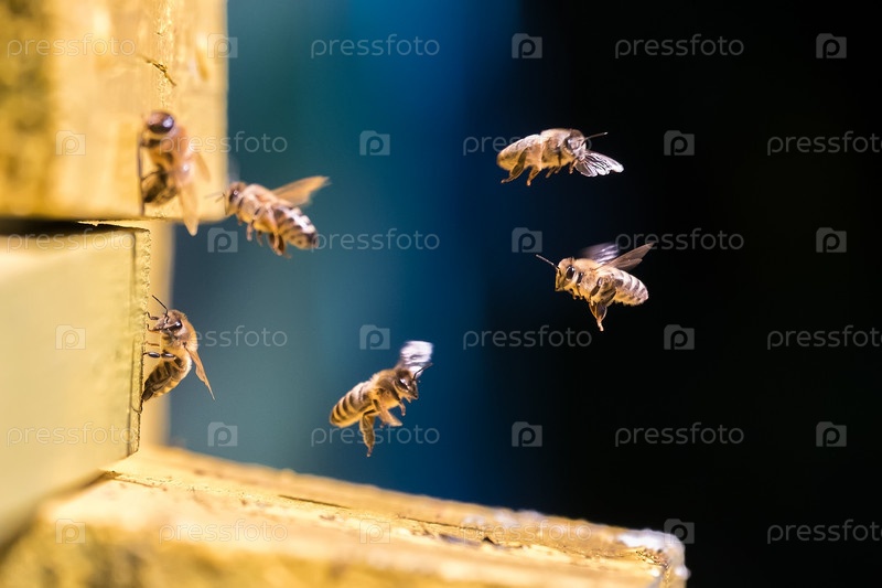Группа пчел возле улья в полете собирает нектар