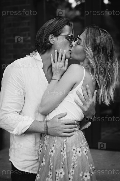 Черно-белое изображение. Закрыть романтический портрет влюбленной пары на свидании на улице. Красивый мужчина и стильная женщина целуются на темном фоне