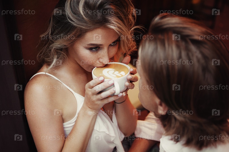 Крупный план портрета красивой женщины, пьющей чашку кофе и нежно смотрящей на мужчину. Счастливая влюбленная пара с романтическим ужином в кафе. Тонировка теплая