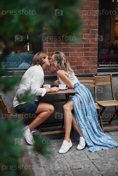 Целующаяся пара в уличном ресторане. Романтическая пара завтракает и пьет кофе на свежем воздухе