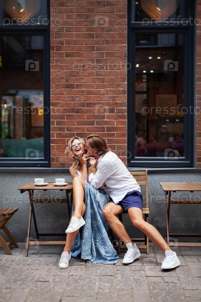 Модный мужчина и привлекательная женщина пьют кофе в кафе на улице и веселятся. Пара счастлива играть