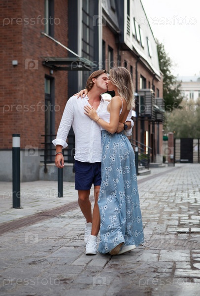 Стильный мужчина и красивая женщина танцуют на городской улице. Пара страстно целуется