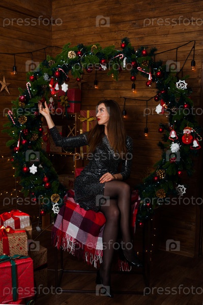 Красивая женщина с длинными волосами в окружении новогодних и рождественских украшений. Празднование Нового года и Рождества