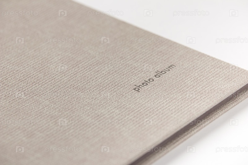 Серый фотоальбом в твердом переплете на белом фоне. Крупный план