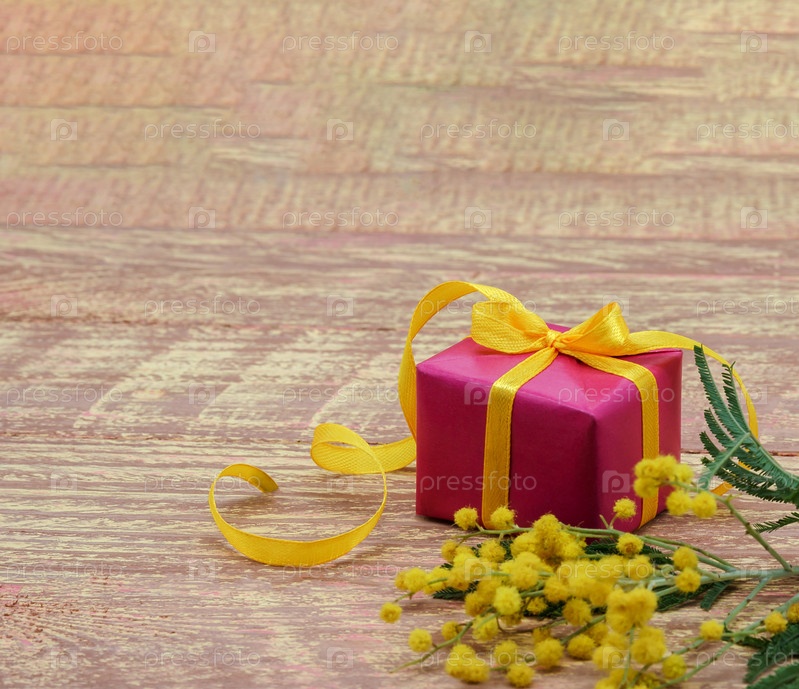 Подарок на деревянном фоне. Подарок и желтая мимоза крупным планом