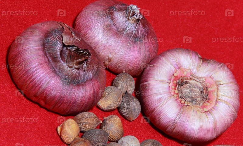 Луковицы гладиолусов на красном фоне крупным планом сортовых растений. Подготовка цветов к посадке