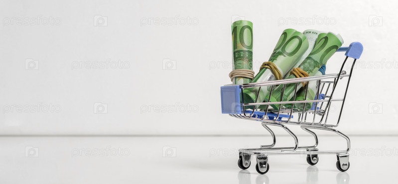 Банкноты в сто евро, свернутые в рулоны, лежат в железной тележке из супермаркета. Баннер
