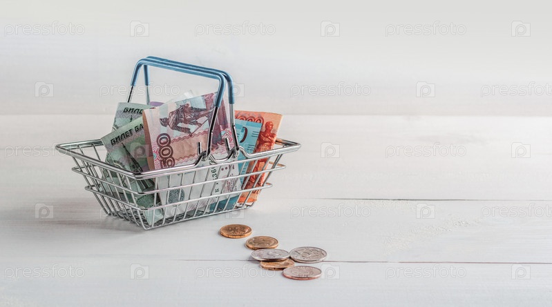 Русские бумажные и металлические деньги в корзине из супермаркета. Продажи и покупки. Копировать пространство