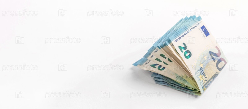 Несколько двадцати евро купюр, сложенных пополам. Баннер. Место для копирования