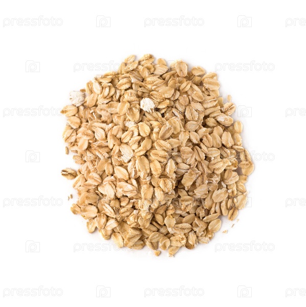 Куча сырых овсяных хлопьев. Овсянка на белом фоне