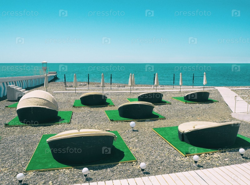 Шезлонги или шезлонги на террасе на пляже